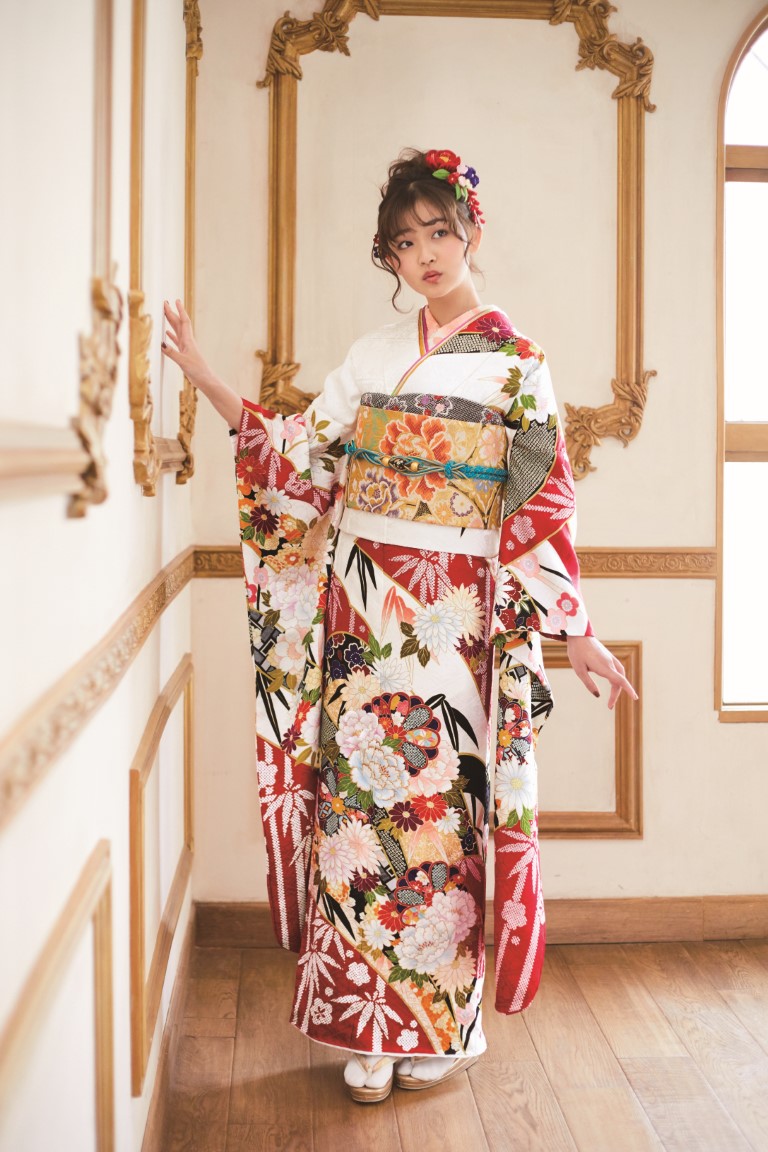 白地の振袖はどの色とも相性がよくコーディネートが自由自在です。